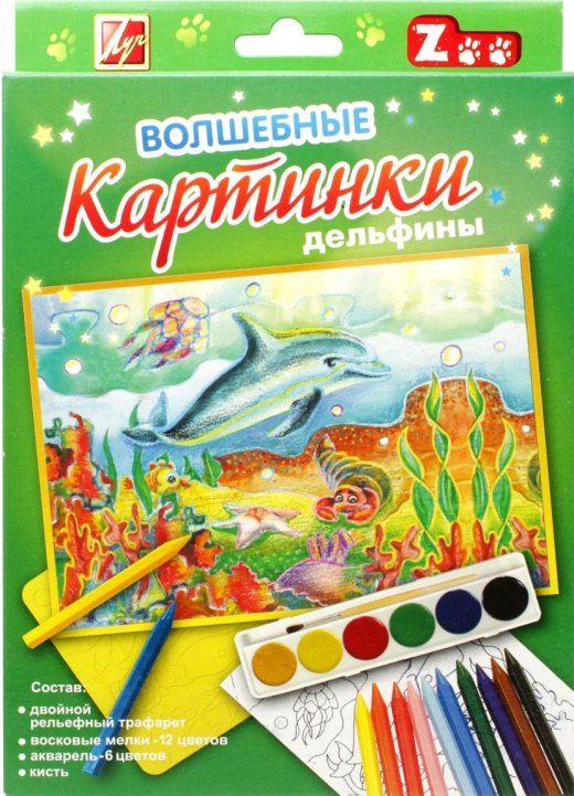 Набор для рисования Волшебные картинки Дельфины – предназначен для работы в смешанной технике, основанной на удивительном сочетании восковых мелков и акварельных красок, в результате которого получаются удивительно яркие и красивые рисунки. Рельефный трафарет, входящий в состав набора, поможет ребёнку получить чёткий, законченный рисунок. Кроме этого, работа с трафаретом поможет в игровой форме подготовить ребёнка к школе: послужит для развития руки и подготовки ее к овладению письмом, развития речи, интеллекта, художественного вкуса.