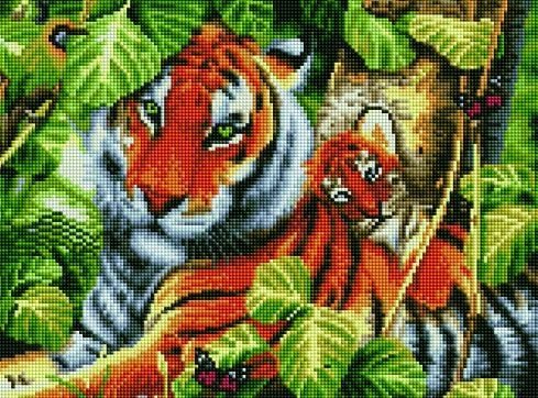 Алмазная мозаика Тигр в лесу – это прекрасный подарок для юных любителей творчества и поделок своими руками. Окунитесь вместе со своим ребенком в мир творчества! С помощью набора предстоит собственноручно создать потрясающее произведение искусства, сделать это весьма просто, но очень интересно.