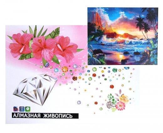 На основу картины нанесен клеящий слой с защитной пленкой и схема с обозначениями, осторожно отклейте небольшую часть защитной пленки, а затем возьмите камушек и приклейте его на соответствующую область схемы. Вы выложите картину из множества маленьких цветных камушков, постепенно заполняя ряд. Таким образом, появляется переливающееся изображение. Каждый камушек выполнен из прочного материала, огранен по типу драгоценных камней и при попадании на грани солнечного или искусственного света образуется мерцающее полотно.