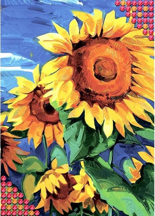 Алмазная вышивка с частичным заполнением Подсолнухи – это замечательный подарок для творческой натуры, он представляет собой набор креативного творчества, для создания ослепительно красивой мозаики из разноцветных кристаллов, чарующей и завораживающей своим блеском и сиянием граней! Создать шедевр совсем не трудно, но весьма увлекательно.