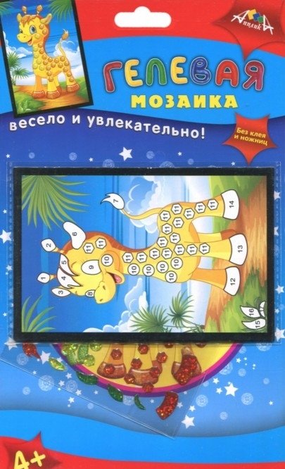Гелевая мозаика Жираф - это картонная основа с нанесенным на него рисунком. Пустые ячейки с номерами необходимо заклеить разноцветными стразами из набора. Каждому цвету соответствует определенная цифра на рисунке. Заклеив всю картинку, ребенок получит яркую и оригинальную поделку, которую можно будет использовать как украшение интерьера, которое будет радовать юного создателя. Такое занятие это замечательный вариант для времяпрепровождения досуга ребенка, который доставит ему массу положительных эмоций и зарядит отличным настроением.