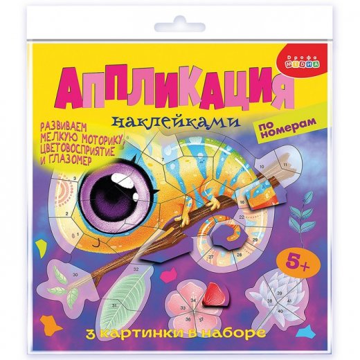 Аппликация наклейками по номерам - это увлекательный набор для детского творчества. В наборе есть все необходимое - 3 картинки-основы с забавными зверюшками и 3 набора наклеек. Набор для творчества очень прост в использовании: все наклейки идут под номерами, нужно просто последовательно приклеить фрагменты рисунка на пронумерованные места на картинке. Важно во время работы стараться наклеивать стикеры как можно ближе друг к другу, тогда аппликация получится аккуратной. Достоинство этого творческого набора заключается в том, что детям не понадобится ни клей, ни ножницы, поэтому его удобно брать с собой в дорогу. Картинки объединены одной темой и отлично дополняют друг друга. Готовыми аппликациями можно украсить детскую комнату, а также они станут прекрасным подарком ребёнку и отличным материалом для детского сада, развивающих центров и творческих кружков. Набор развивает мелкую моторику, цветовосприятие и глазомер.