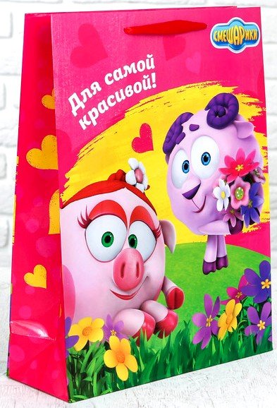 Пакет Смешарики Для самой красивой – несомненно понравится девочке. Его можно использовать как небольшой презент или как красивую упаковку под непосредственный подарок. Ламинированные бумажные пакеты — лидеры по популярности среди подарочной упаковки.