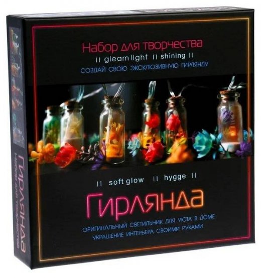 Во время творческого процесса у ребёнка развивается мелкая моторика рук, цветовое восприятие, усидчивость, воображение и творческие способности.Комплектность: светодиодная гирлянда с отсеком для батареек, стеклянные баночки с пробковыми крышками (10 шт.), разноцветные искусственные цветы из полимерных материалов, разноцветный песок.