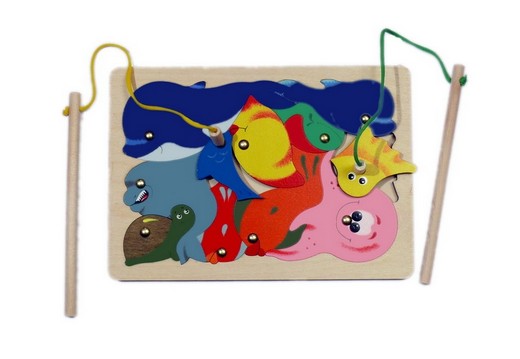 Деревянная мозаика Рыбалка представляет собой рамку с деталями-вкладышами. Эта игрушка одновременно является и пазлом, т.к. детали можно сложить в рамку одним единственным способом. В комплекте к мозаике есть удочки с "крючками-магнитами, с помощью которых можно ловить детальки за металлические заклепки, диаметр которых около 1 см. Магниты на удочках сильные, поэтому улов не сорвется с крючка. Играть могут одновременно два человека, что добавляет азарта. Мозаика состоит из 11 элементов: кит, дельфин, акула, осьминог, черепаха, медуза и пять рыбёшек.