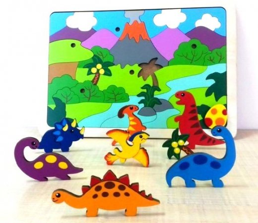 Состав набора: рамка, 47 деталей, цветная схема сборки с названием динозавров, вкладыш со стихами-загадками про динозавров.