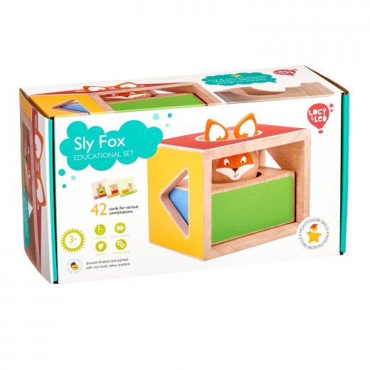 Набор состоит из 3-х деревянных блоков с прорезями различной формы, деревянной фигурки лиса, брошюры с подсказками-ответами, двухсторонние карточки с заданиями, разного уровня сложности.