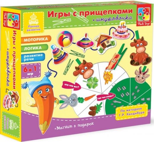 Состав набора: 1 круг, 20 деталей, 6 прищепок, 8 карточек, шнурочек, магнит.