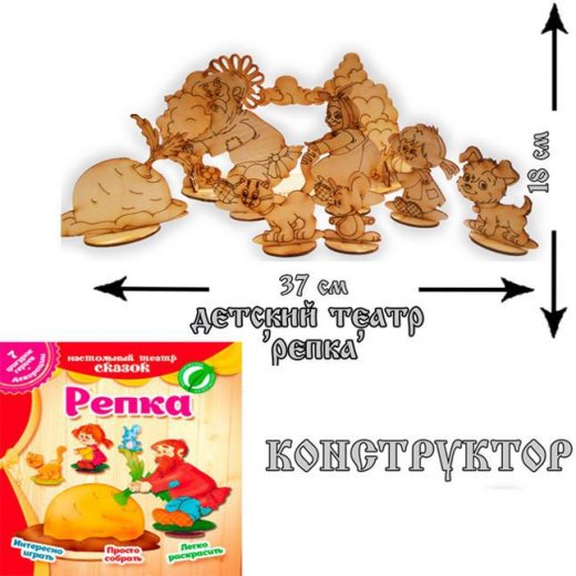 Настольный театр "Репка" – это деревянный конструктор "Домашний театр - Репка" сделан по мотиву известной русско-народной сказки про то, как семья и их домашние животные вместе тянули огромную репу. Данный конструктор отличается тем, что его нужно не только собирать, но и разукрасить, а потом еще и играть, делать постановки, то есть устраивать настоящий домашний театр.