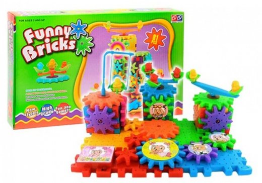Конструктор Funny Bricks – это двигающийся конструктор "ВЕСЕЛЫЕ ШЕСТЕРЕНКИ. Состоит из строительных пазлов разных цветов, соединительных элементов и шестеренок разного диаметра. Самый главный элемент в этом конструкторе — это блок с моторчиком, который оживляет весь механизм. Дополнительно в конструкторе есть элементы для создания каруселей и качелей. И конечно же кто-то должен кататься на этих каруселях — для этого в комплекте есть маленькие мишки и обезьянки. По желанию на шестеренки можно наклеить красочные наклейки, которые идут в комплекте.