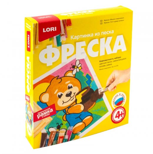 Состав набора: цветной песок, самоклеящаяся основа, рамка, инструкция на упаковке.