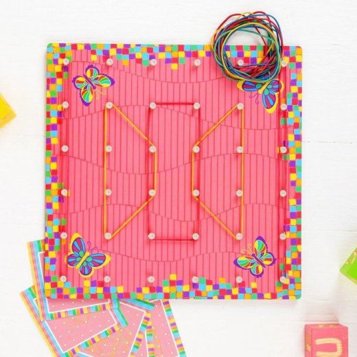 Геоборд - это специальная доска для конструирования различных изображений с помощью равноудалённых друг от друга штырьков и резиночек. Резиночки малышу предстоит нанизывать на штырьки и создавать таким образом разнообразные узоры.