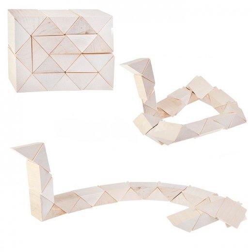 Головоломка Змейка – это интересный и занимательный подарок для ребенка, который обязательно ему понравится. Змейка состоит из 24 одинаковых треугольников, которые соединены между собой механизмом, который позволяет вращать элементы между собой. Задача состоит в сборке различного рода геометрических фигур, животных и прочих ассоциативных вещей. Юный творец абсолютно волен в своем воображении и фантазии и может делать фигуры, какие только придут ему на ум.