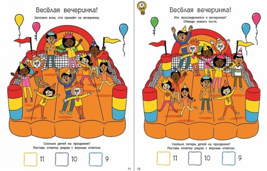 В книге собраны головоломки разного типа: "раскрась по памяти", "кто лишний", "следопыт", упражнения на запоминание, внимание и счёт.