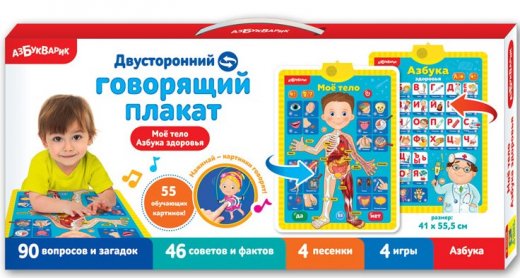 Плакат Мое тело – это двусторонний говорящий плакат, который станет незаменимым помощником родителей! На первой стороне плаката представлены интересные факты о теле человека и изображены самые важные органы, на второй – говорящая азбука, слова и полезные советы! Плакат можно повесить на стену или играть с ним, где будет удобнее. Громкость звука регулируется.