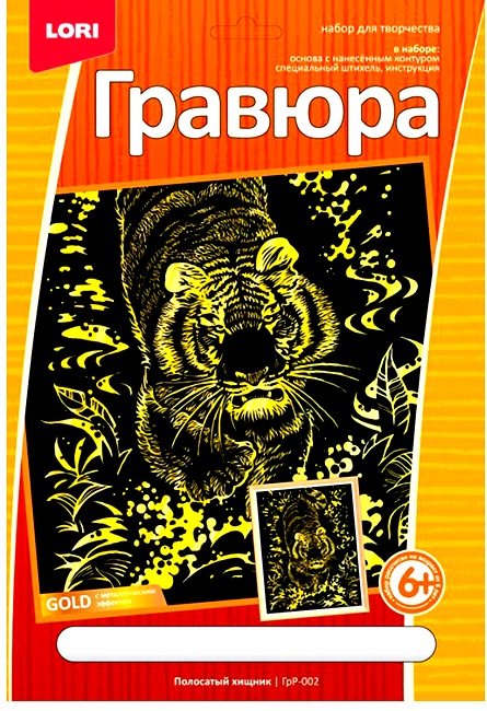 Гравюра Полосатый хищник – содержит все необходимое для создания собственного произведения искусства. В комплект входит основа, на которую нанесена краска с контуром рисунка, специальный штихель и инструкция на русском языке. Контур изображения уже нанесен на фон основы. С помощью специального штихеля изображение процарапывается по контуру, и из-под черной краски появляется основа с эффектом золота. В результате получается эффектное контрастное изображение свирепого хищника.