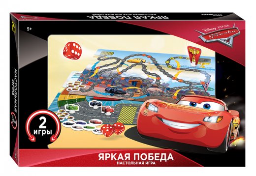 Настольная игра "Яркая победа" - это семейная игра, сделанная по мотивам популярного мультфильма "Тачки" корпорации Disney.
