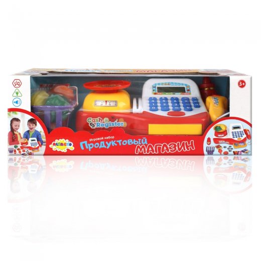 Игровой набор оснащён настоящими весами, калькулятором и сканером. Если положить продукт в чашу весов - она покажет его вес! Кассовый аппарат издает реалистичный звук работающей кассы. Отдел для денег открывается с помощью ключика или при нажатии на специальную кнопку - все как в настоящем магазине! Корзинка с продуктами, банковские карточки, монеты и игрушечные купюры помогут ребенку освоить навыки счёта и помогут сделать игру в магазин максимально реалистичной.