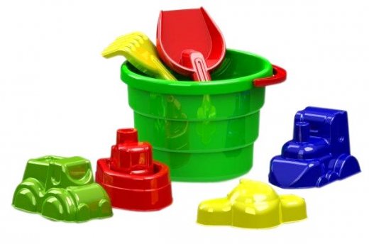 Состав набора: ведро, лопатка, совок, 4 формочки.