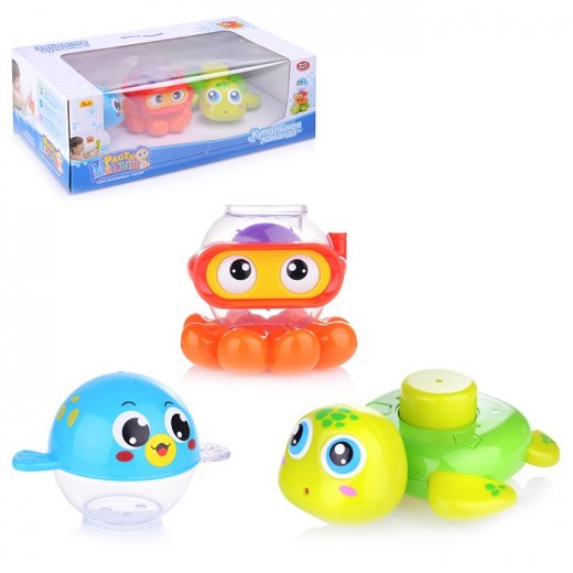 Набор "Веселое купание в коробке" сделают купание малыша очень интересным и увлекательным занятием. Даже самый большой не любитель купаться с удовольствием примет водные процедуры, где можно будет играть с такими яркими и интересными игрушками. В игровом комплекте есть рыбка-чашечка, которая преобразуется в две маленькие чашечки, черепашка, у которой на колесиках, при нажатии на кнопку втягивает и брызгает водой и осьминожек-леечка, которого можно закрепить на стенке в ванной или кафельной стене, при помощи присоски. В такой яркой и веселой компании ребенку точно не будет скучно принимать ванну.