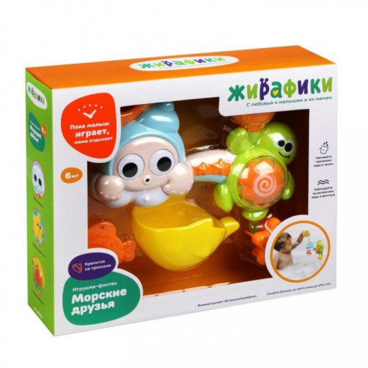 Игрушка-фонтан «Морские друзья» превратит купание малыша в настоящее приключение! Чтобы чудо-фонтанчик заработал, ребёнку предстоит налить черпачком воду в улитку и в черепашку. После этого можно будет наблюдать интересные процессы, которые начнут происходить в игрушке под действием воды: у улитки будут вращаться глазки, у черепашки – панцирь, а затем начнёт вращаться весёлая морская звёздочка!