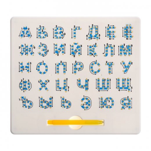Поле содержит 33 контура букв, в каждом есть отверстия с магнитными шариками. Запоминание всех букв алфавита — значимый этап в обучении малыша. Очень важно, чтобы ваш кроха делал это с удовольствием и не скучал!