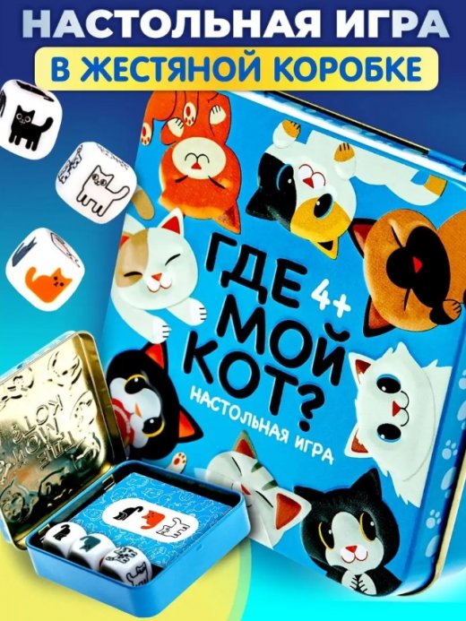 Хотите проверить себя на быстроту реакции? Лучшая увлекательная дорожная настольная игра, как для двоих, так и для большой компании детей и взрослых, в семейном кругу. “ Где мой кот ” поможет тебе в этом! Обучающая карточная игра хранится в компактной жестяной коробочке, благодаря чему игру можно брать с собой в дорогу, для отдыха на природе.