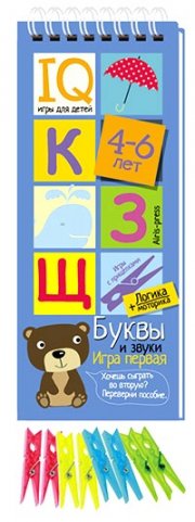 IQ игры для детей Буквы и звуки – это игровой комплект для развития речи, мышления и моторики. На красочных станицах блокнота в два столбика расположены карточки с рисунками и буквам. У каждой карточки есть своя логическая пара. Задача ребенка – найти парные картинки и прикрепить к ним прищепки одного цвета, располагая их в округлых прорезях с боков карточек. Когда все задания на страничке выполнены, ребенок может самостоятельно проверить правильность решения. Для этого нужно перевернуть страницу и провести пальчиком по лабиринту на обратной стороне. Если линия соединяет прищепки одного цвета, значит задание выполнено, правильно.