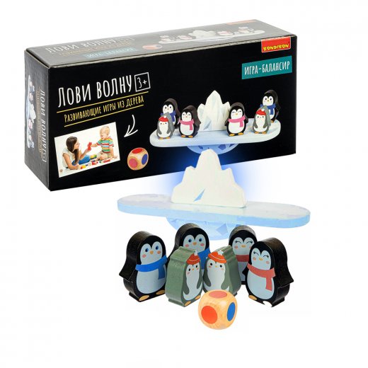 В комплект входит: балансир, 6 деревянных пингвинов, игральная кость.