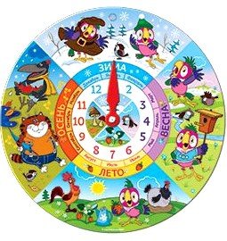 Обучающая игра Часы Попугай Кеша – это интересная и занимательная игрушка, которая выполнена в очень ярких и красочных тонах. Такая игрушка без труда привлечет внимание ребенка. Двухсторонние часы "Союзмультфильм" помогут ребенку выучить времена года, месяцы, а также распознавать время. Каждая из двух сторон оформлена изображениями героев мультипликационного фильма про попугаю Кешу. С одной стороны нарисовано 12 цифр, каждой из которых соответствует определенный месяц. Также с помощью цветовой палитры выделены и проиллюстрированы времена года. Вторая сторона часов расскажет ребенку о времени суток и научит определять время, ведь цифры, расположенные в центральном круге, обозначают время.