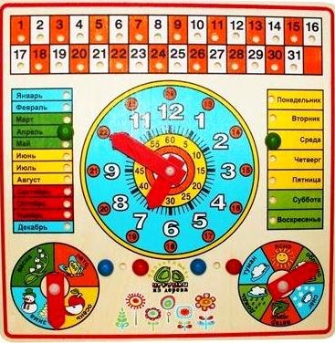 Рамка Календарь – это удобное наглядное пособие, которое можно использовать с детских садах и дома. Ежедневно заполняя такой календарь ребенок внимательнее присмотрится к особенностям природных явлений, таких как, изменения погоды, сезонность в годы или времена года, деление года на месяца, выучит дни недели. Рамка календарь - это отличный подарок для дошкольника. В центре есть большой циферблат с цифрами. Причем они есть по кругу в три ряда: в самом центре указаны минутки на желтом фоне, далее белые цифры показывают часы, а черные цифры в кружочках помогают определить время после полудня.