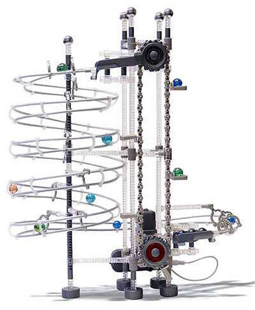 Конструктор Executivity – это увлекательное занятие для всей семьи. С помощью этого комплекта ребенок с Вашей помощью создаст своими руками вечный двигатель, представляющий собой сложную и интересную конструкцию, по которой беспрерывно двигаются шарики. Они постоянно поднимаются и опускаются по рельсам в виде спирали, которые создаются путем подвешивания металлических тросиков на специальные выносные крепежи и скрепляются между собой снизу, аналогично Американским горкам. Эта модель конструктора отличается от предыдущей модели Gear Master MG (173 детали) большим количеством деталей и имеет более сложный и интересный спуск в виде спирали. Вы можете проявить фантазию и сконструировать свой "вечный двигатель".