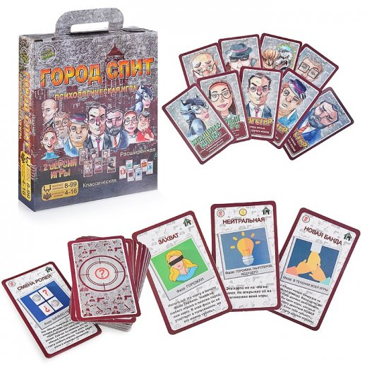 "Город спит" - ролевая игра с психологическим уклоном, которая позволяет задействовать от 4 до 16 человек. По своему усмотрению игроки выбирают варианты игры – это может быть классическая игра или расширенная с действиями, предложенная комплектация позволяет использовать оба варианта.