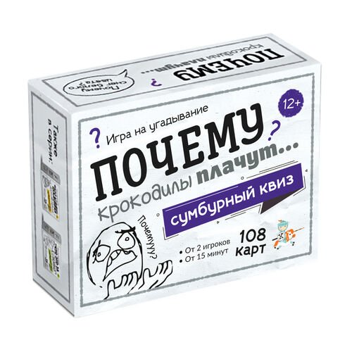 Настольная игра для большой компании "Сумбурный квиз. Почему крокодилы плачут" - это интеллектуально-развлекательная игра, в которой игроки проверяют эрудицию, отвечая на вопросы из разных областей знаний.