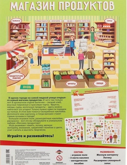 Этот набор будет способствовать развитию таких важных навыков, как: мелкая моторика, логическое мышление, внимательность и воображение. Набор «Магазин продуктов» подскажет малышу, какие отделы бывают в магазине, почему кассир стоит у кассы и как навести порядок на полках каждого отдела. Внутри находится большое игровое поле с картинкой магазина. Малышу предстоит распределить продукты по нужным отделам с помощью наклеек. Виноград окажется в отделе «Фрукты», а торт — в «Кондитерской»! Все наклейки — многоразовые, их можно использовать снова и снова. Также в набор входит методическое пособие для родителей, которое подскажет, как, играя в магазин, ребёнок сможет расширить кругозор и пополнить словарный запас.