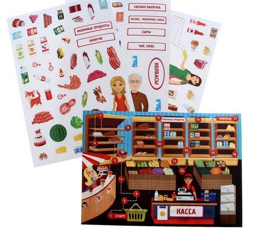 Бери наклейки и поле, украшай продуктами полки, распределяй покупателей по залу. Вы заметили на поле красные цифры? Это ходы для игры-бродилки! Возьмите кубик и фишки (они не входят в набор) и попробуйте первыми добраться от старта к финишу! Зови друзей, выбирайте роли (продавец, покупатель, кассир), нарисуйте деньги и разыграйте один день за прилавком.