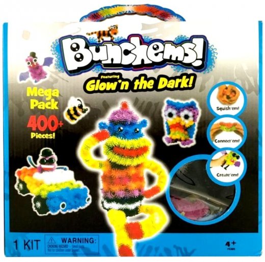 Уникальное отличие данного конструктора от классического Bunchems заключается в наличии пластичных, мягких шариков-репейников, которые обладают способностью светиться в темноте. Для того, чтобы поделка отдавала свечение в темной комнате, предварительно е нужно подержать на свете. Микс радужных элементов состоит из всех цветов, обожаемых детьми: голубого, сиреневого, зеленого, желтого, красного, оранжевого, белого, черного.