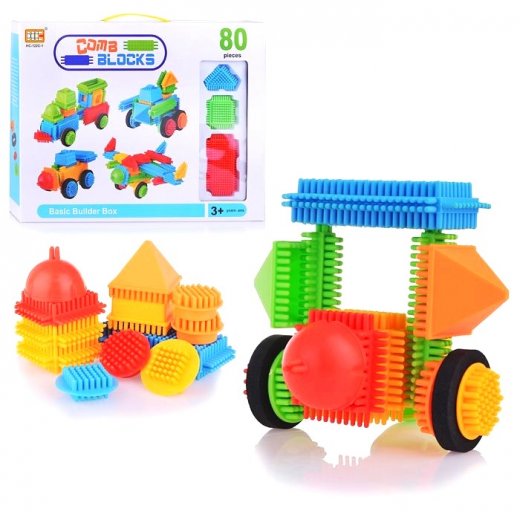 Оригинальный и необычный конструктор Comb blocks позволит ребенку собрать яркие и забавные конструкции. Детали базовых геометрических форм и необычные блоки легко соединяются, сцепляясь щетинками. Вся площадь элементов усеяна скругленными иголочками, по периметру также расположены щетинки. Это позволяет фиксировать детали со всех сторон.