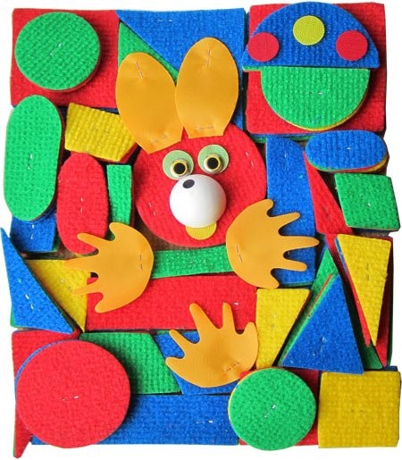 Конструктор содержит игровое поле из ковролина размером 25х30 см и набор деталей (тоже из ковролина) с липучками (липучки прикреплены с помощью степлера). В набор входит 14 элементов простейших геометрических форм (круг, полукруг, квадрат, овал, ромб, трапецию, прямоугольники 3 видов и 5 видов треугольников), большого, среднего и малого размеров, трех цветов, по 1 штуке каждого. А также набор дополнительных деталей (глаза, носы, лапки), с помощью которых можно собрать разных зверей.Комбинируя множество мягких элементов, ваш малыш самостоятельно собирает 33 забавные картинки - от божьей коровки до паровоза - а также неограниченное количество собственных моделей.