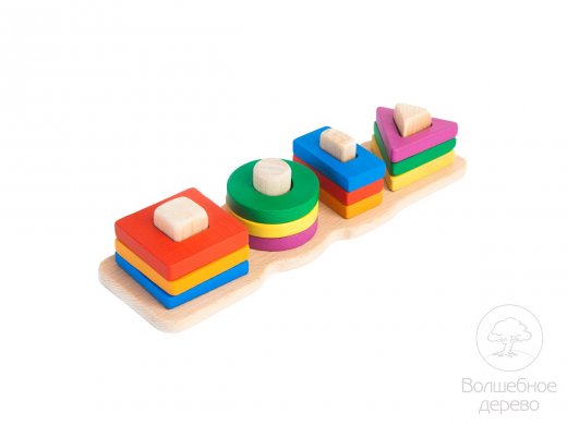 "Сортер 4х1" представляет из себя четыре стержня разной геометрической формы, на которые нужно надеть разноцветные детали нужной формы.