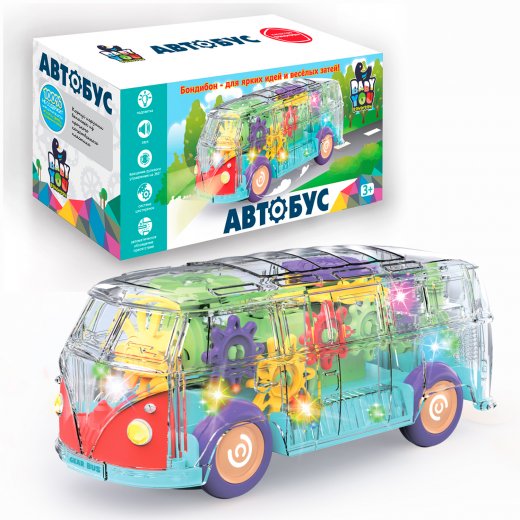 Разноцветные шестерёнки весело крутятся в прозрачном корпусе автобуса!