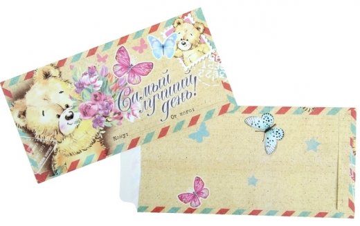 Конверт подарочный Самый лучший день – подойдет в качестве атрибута, как для взрослого так и для ребенка. Конверт подойдёт для декора скрап-альбомов, хранения секретиков в блокнотах или анкетах. В него можно положить небольшое поздравление, конфетку-комплимент, денежный подарок или оставить записку с тёплыми словами для любимого человека.