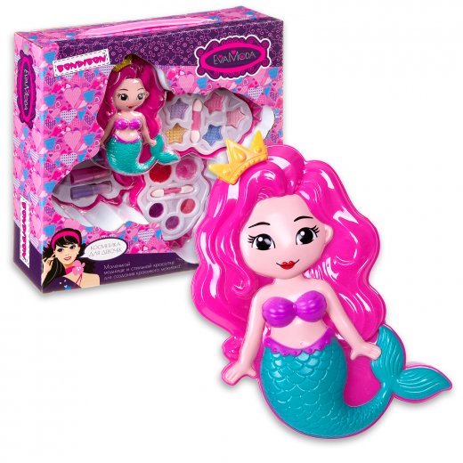 В наборе: косметичка-русалочка, тени для век 5 оттенков (3г), помада 2 оттенка (1,6г), блеск для губ 6 оттенков (3,5г), лак для ногтей (5г), аппликатор 2 шт., заколки 2шт.
