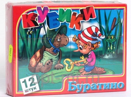 Кубики "Буратино" - представляет собой набор из 12 кубиков, на гранях которых изображены фрагменты из одноименной сказки. С их помощью можно собрать шесть красочных картинок, на которых изображены самые разные герои этой сказки. Картинки весьма красивы и красочны, чем обязательно порадуют малыша. Кроме того, из них можно строить различные небольшие постройки, выкладывать на полу фигурки.