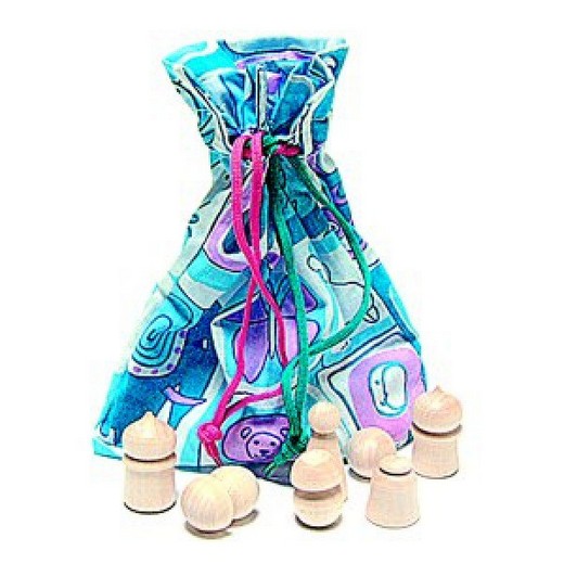Набор состоит из полотняного мешочка и 8 пар деревянных неокрашенных фигурок: шариков, грибочков, колокольчиков, елочек, пирамидок, неваляшек, шахматных слонов и пешек. Набор используется как увлекательная игра, развивающая речь, внимание, память и логическое мышление. С помощью этой игрушки можно познакомить ребенка и с азами математики. Задания могут быть, например такими: на ощупь найти для каждой фигурки пару, пересчитать все фигурки, продолжить заданную логическую цепочку, найти лишнее (без пары, например), угадать спрятанную фигурку и т.д.