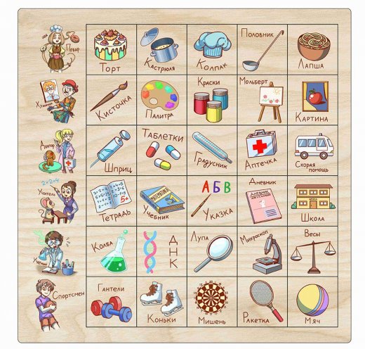 Развивающая игра "Ассоциации: Профессии" – представляет собой деревянную панель, с нанесенными на нее изображениями. Чтобы получить целостный ряд, необходимо правильно подобрать таблички к каждой картинке.