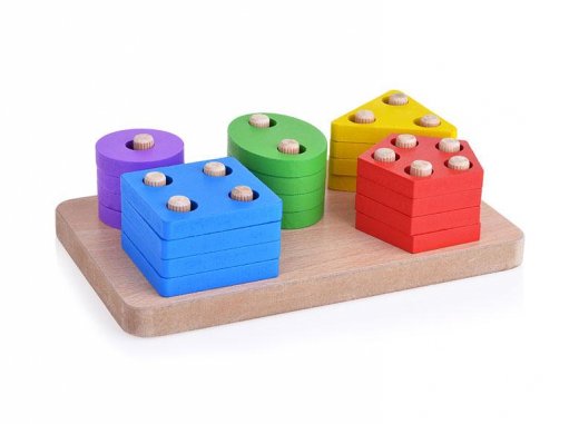 3. Умению различать цвета - все фигурки геометриков цветные и их можно использовать в изучении основных цветов. В этом случае можно играть с малышами в игру без подставки с штырьками. Предложите ребенку группировать одинаковые по цвету геометрические фигуры в "кучки". Не забывайте озвучивать названия каждого цвета и названия фигуры. Более сложное задание: расставить геометрические фигуры на подставку так, чтобы первая (нижняя) линия была одного цвета, следующая линия другого цвета и т.д.