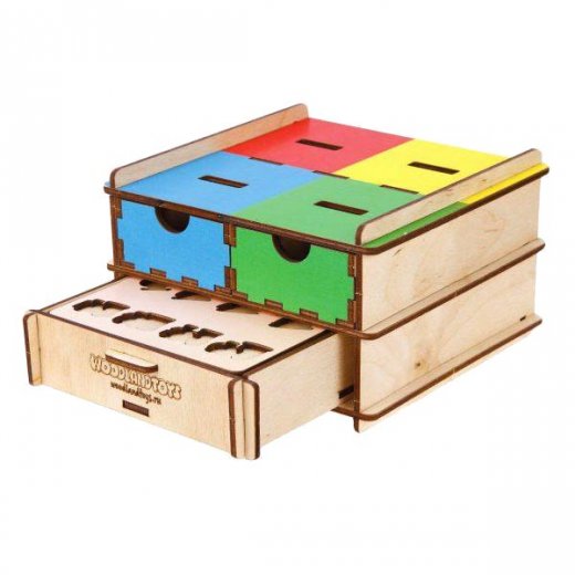 Комплектация: деревянная корпус комода, 4 маленьких выдвижных ящика, 1 большой выдвижной ящик, плашки с набором деревянных фигур.