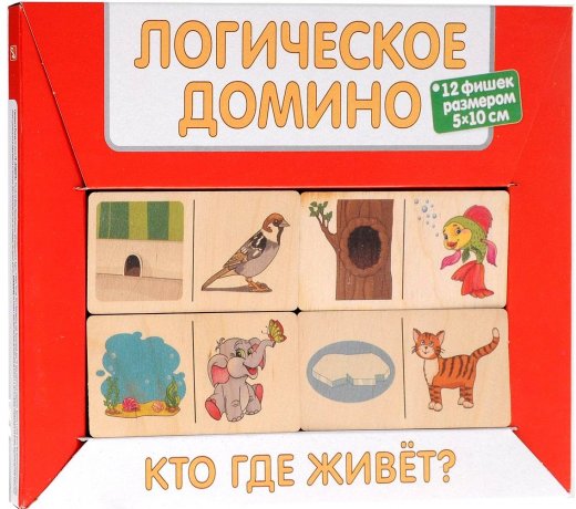 Домино логическое Кто где живет? – — прекрасно подойдет даже для самых маленьких игроков. Фишки большого размера 50/100 мм, малышу удобно держать такую фишку. Рисунки на ней — яркие и большие. В это домино можно играть не только дома, но эффективно использовать для занятий в детском саду. Правила игры совсем просты, вместо цифр и точек здесь нужно совмещать одинаковые картинки. Такое занятие это весьма интересный и увлекательный вариант для времяпрепровождения досуга ребенка, который подарит ему массу положительных эмоций, а сам процесс, несомненно приведет ребенка в восторг и зарядят его отличным настроением.