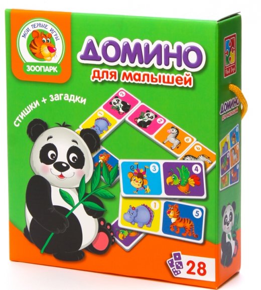 Состав набора: 28 костяшек домино, книжка со стихами и загадками.